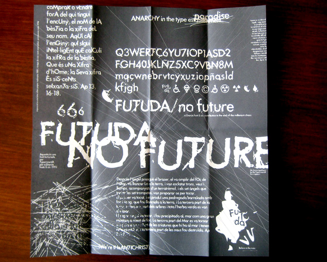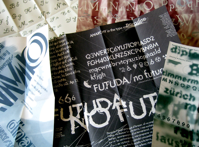 El catálogo de tipos incluÃa fuentes como la Matilde Script, que establecÃa una relación directa entre el pixel, como unidad de representación, y el punto de cruz de las abuelas. Ozó type ponÃa en cuestión algunos de los argumentos sobre legibilidad en relación con el medio ambiente. Helvética Fondue era una versión irónica de la omnipresente Helvética, paradigma del estilo internacional. Futuda/Nofuture fue una interpretación de las utopÃas de la Modernidad aplicadas en plena crisis de los 1990.