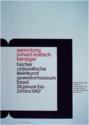 En el Basler Plakatsammlung (Colección-archivo de carteles de Basilea) hay catalogados un total de 33 carteles realizados entre 1953 y 1970 e impresos mediante la técnica de linóleo o en offset. La mayor parte de ellos de temática cultural, concebidos por encargo para exposiciones en los dos principales museos de Basilea, el GM y el Kunsthalle; 6 de ellos premiados como mejor póster del año (24/año): «Glaskunst aus Murano» (1955), «Max Beckmann» (1955), «Japanische Kalligraphie» (1956), «Richard Doetsch-benziger» (1967), «die Zeitung» (1958) y «ungegenständliche Photographie» (1960).