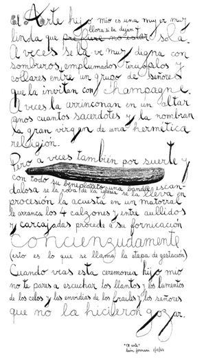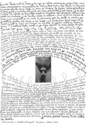 De una amplia carrera como artista plástico, las piezas escritas de León Ferrari (Argentina, 1920) atraen por un estilo gráfico que debe reivindicarse entre diseñadores gráficos y tipógrafos, en una arqueologÃa del signo de alto valor visual. Piezas únicas de trazos eróticos, desprolijos, aunque perfectamente ensayados que devienen en encendidos manifiestos polÃticos. León Ferrari muestra a través de sus escritos personales y sus dibujos manuscritos, –que datan en su mayorÃa de 1964, año en que se interesó por la religión–, su mirada aguda sobre la realidad.Â