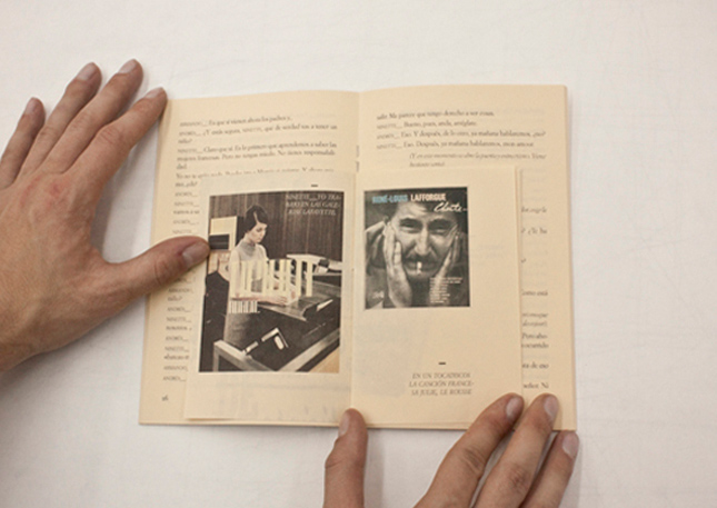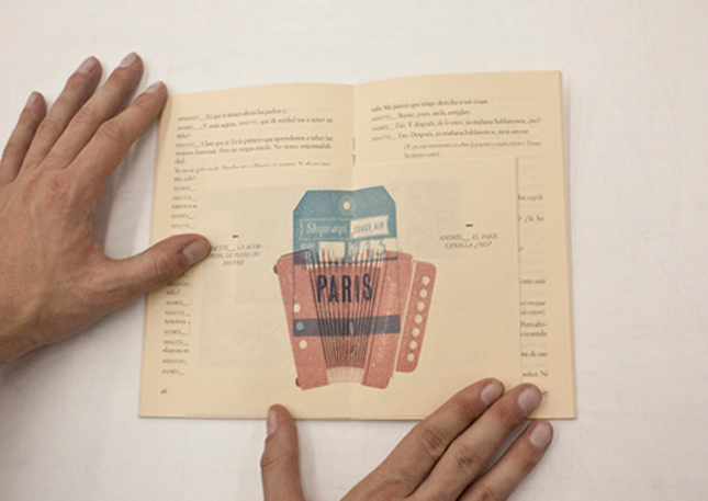 Son estos elementos los que he querido trasladar al papel, desgranando la escenografÃa que describe el autor en forma de ventanas, poniendo cara al reparto a través de un álbum familiar o incluyendo un cuadernillo interior en cada acto, que nos muestra un poco el contexto gráfico en el ParÃs de los años 1960, en el que transcurre la obra, atendiendo a esas acotaciones antes citadas. En ellos podemos encontrar la portada del disco que suena, cartelerÃa de los almacenes en los que trabaja su protagonista asà como de obras que se citan en el texto y algunas contribuciones para ilustrar trozos de diálogos especialmente relevantes. Siempre se ha atendido al estilo gráfico de la época basado en la documentación que he recopilado y estudiado para el proyecto.Â
